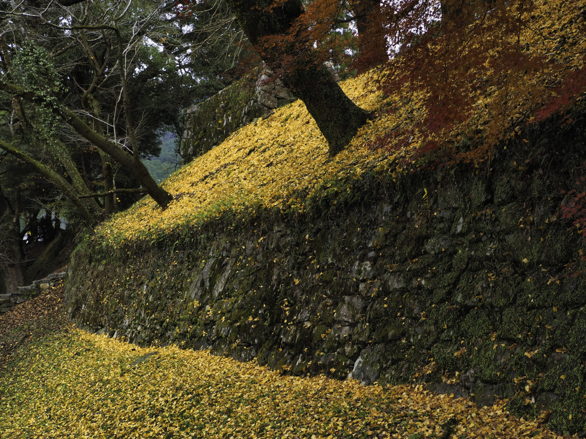 黄金色の絨毯が広がる秋月城跡の石垣