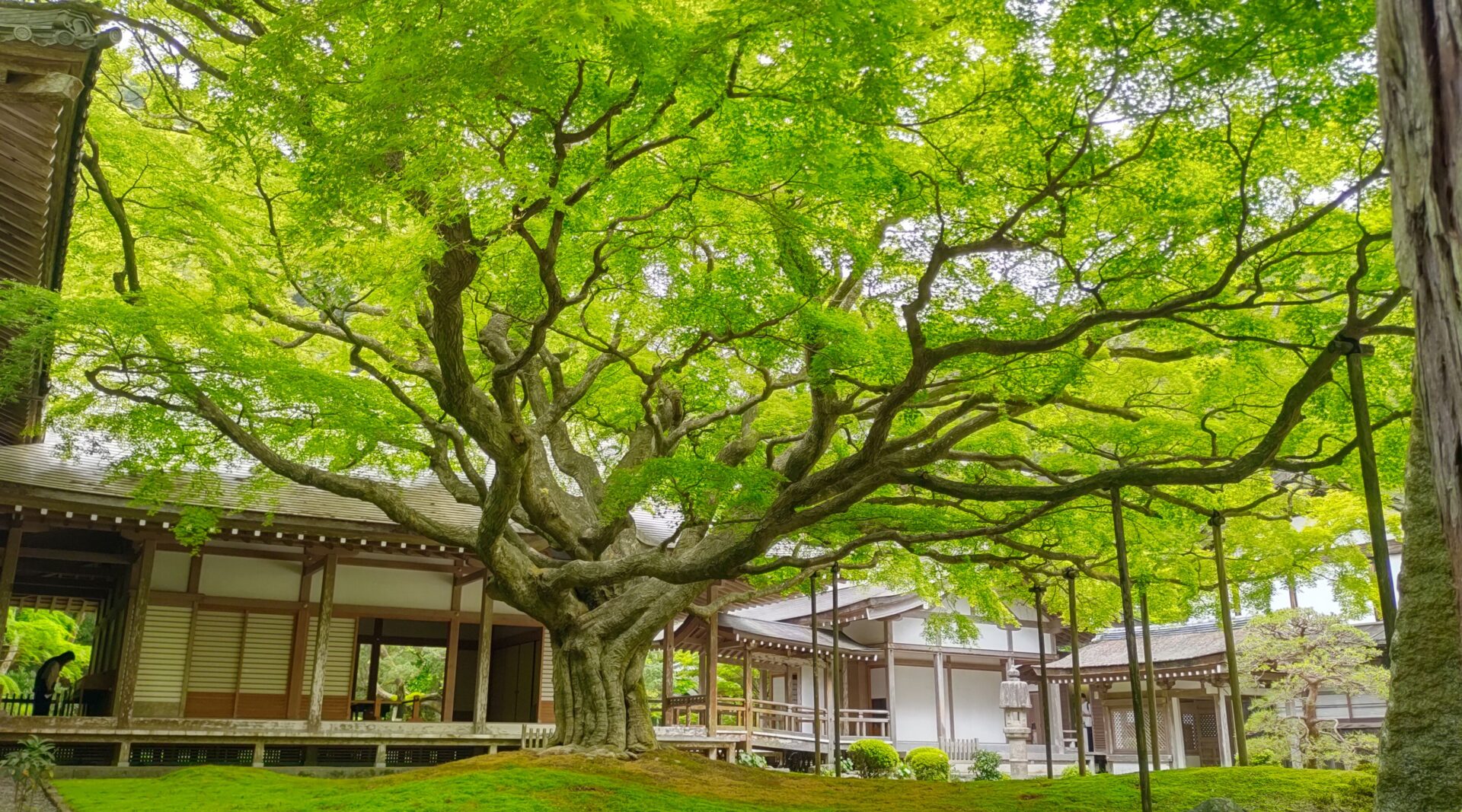 境内に広がる巨木の枝と青葉のトンネル
