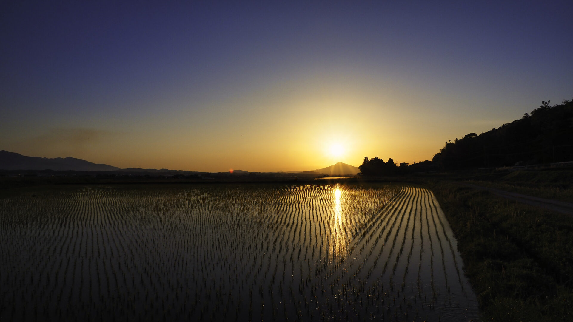 夕陽が水田の稲の列に反射する糸島市郊外の風景
